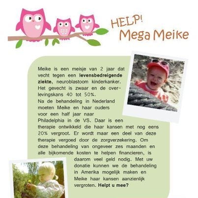 De opbrengst gaat naar vooral kinderen die onze steun hard nodig hebben. Zo hebben wij Meike geholpen die aan een zeldzame vorm van kanker lijdt, Joep die een ernstige hersenbeschadiging en verlamming heeft opgelopen na een val van de trap en Bart van 2 die met ernstige longproblemen kampt.